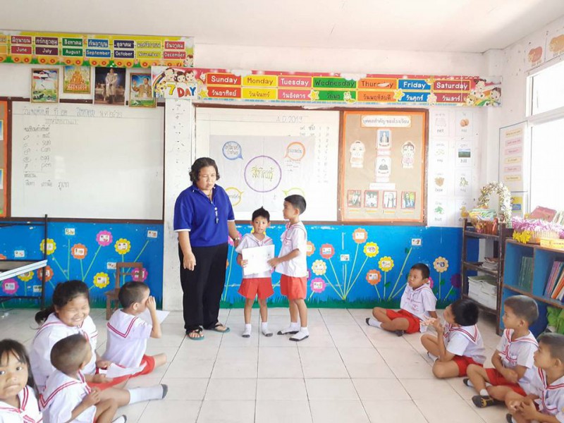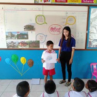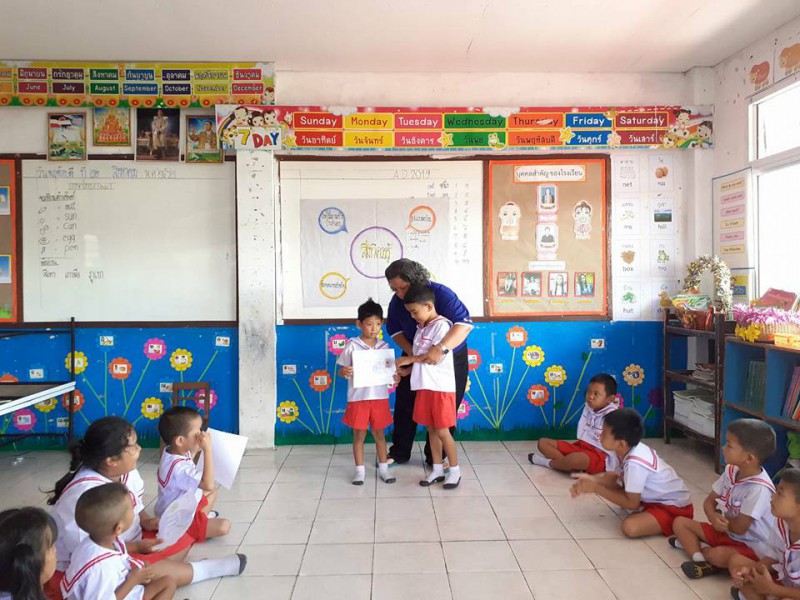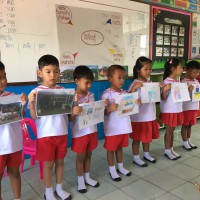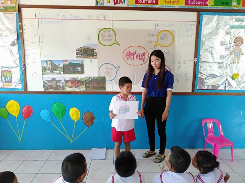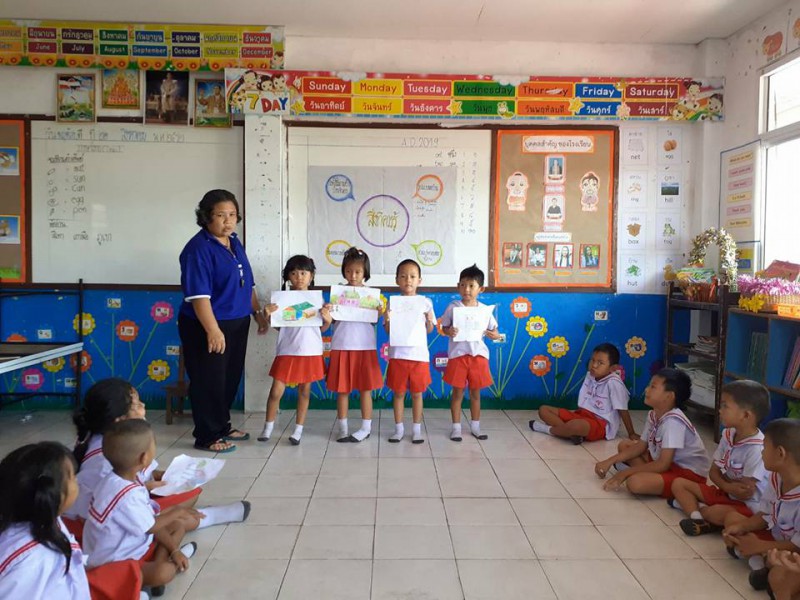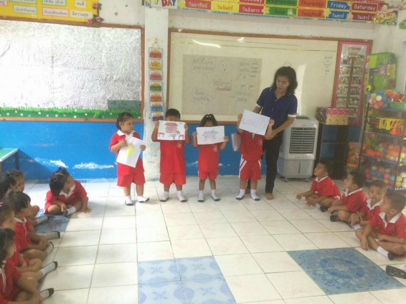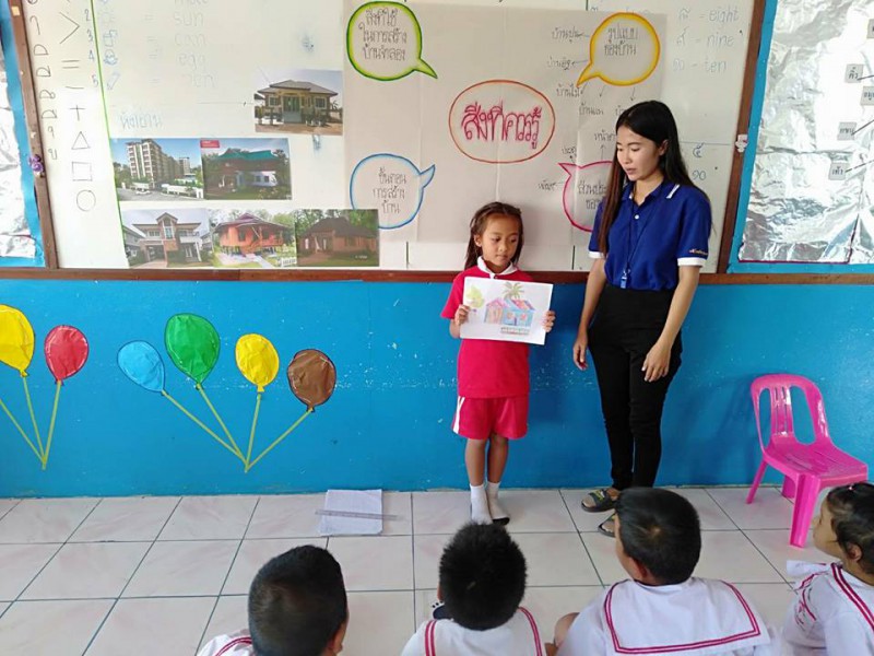จากนั้นแต่ละกลุ่มก็จะช่วยกันวาดภาพบ้านท้าน้ำท่วมและนำเสนอผลงานหน้าชั้นเรียน