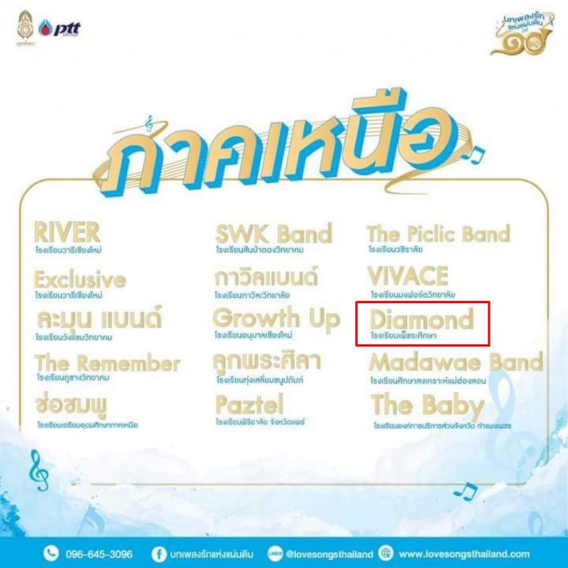 การประกวดดนตรีสากลร่วมสมัยบทเพลงรักแห่งแผ่นดินปีที่ 10. "เพื่อชิงถ้วยพระราชทานสมเด็จพระนางเจ้าสิริกิติ์พระบรมราชินีนาถพระบรมราชชนนีพันปีหลวงที่เซ็นทรัล เฟสติวัล&9. จังหวัดเชียงใหม่ |