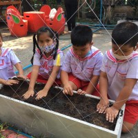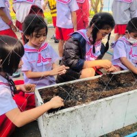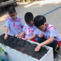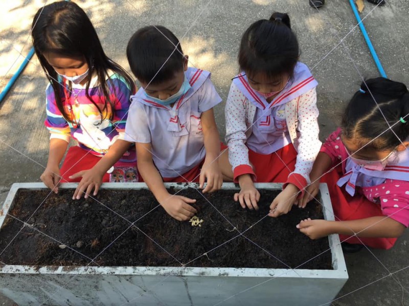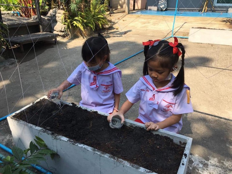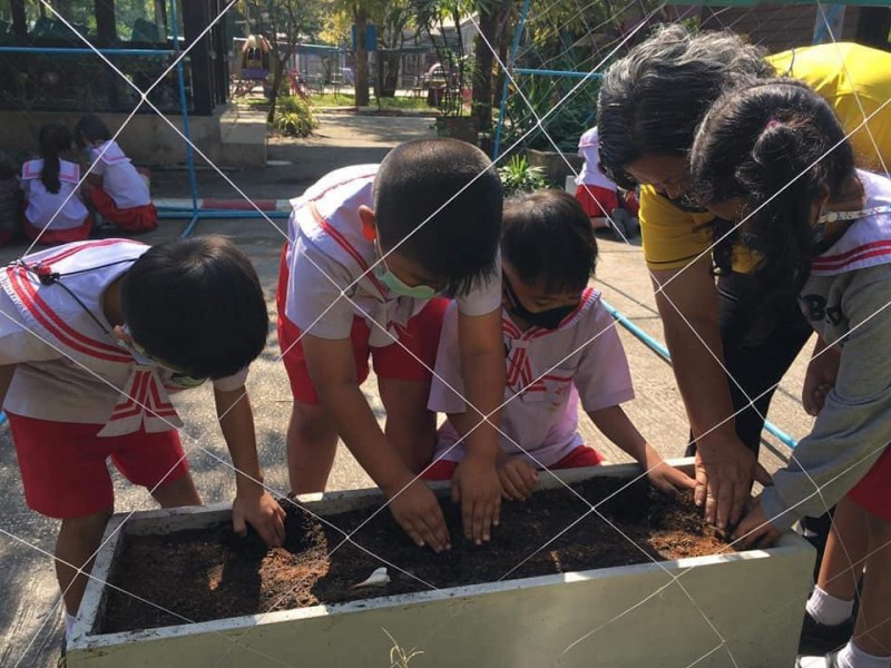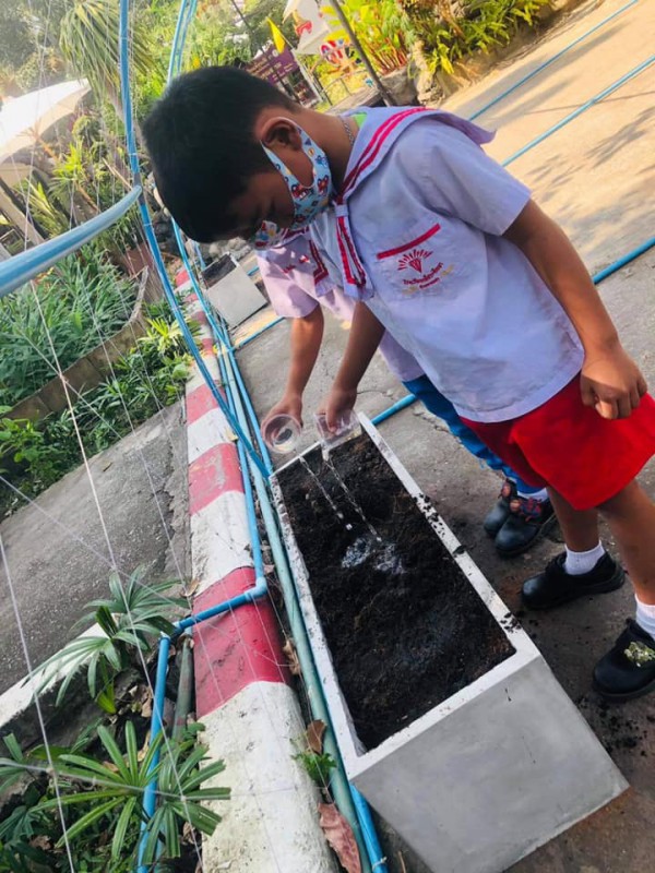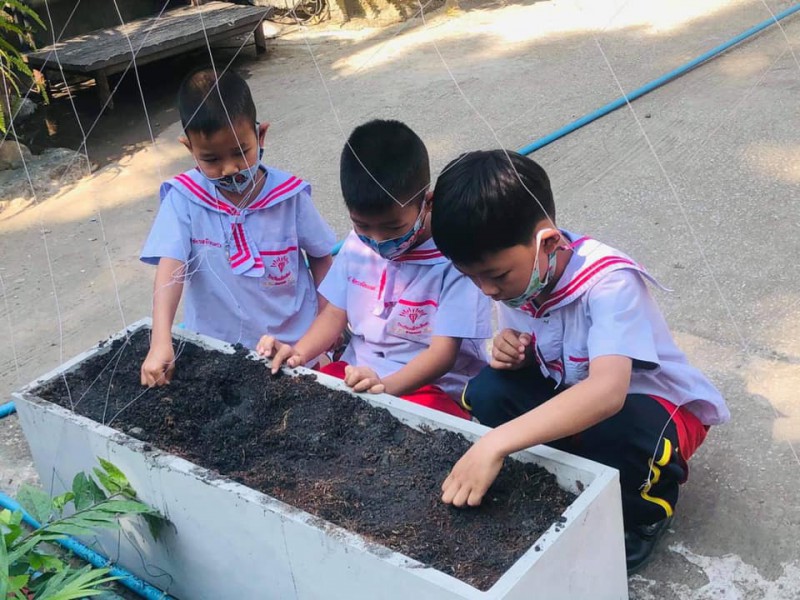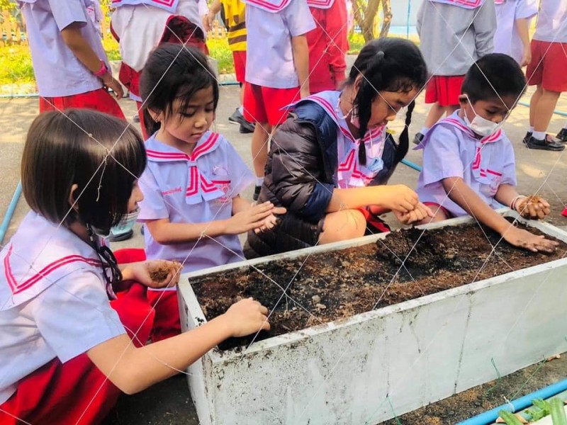 ทักษะการจัดกิจกรรม : ขั้นตอนแรก นักเรียนปรับหน้าดินให้เข้ากัน