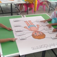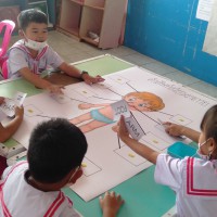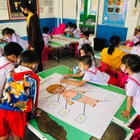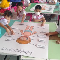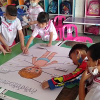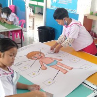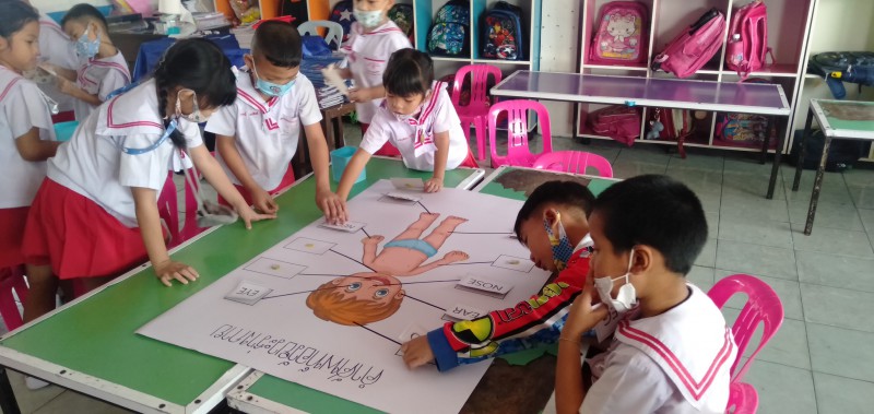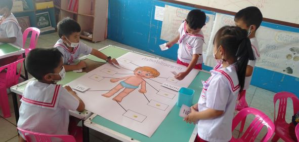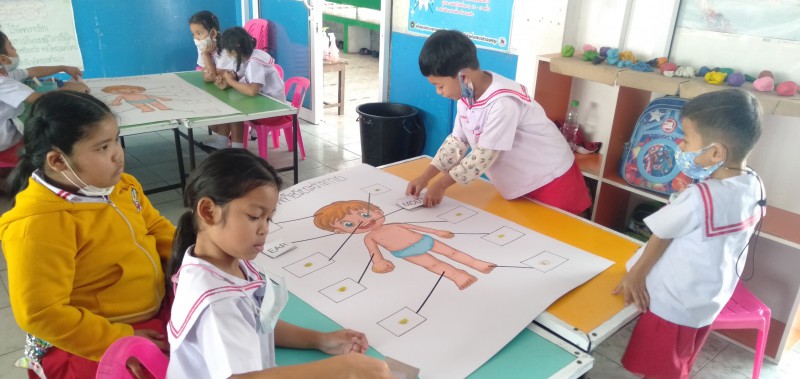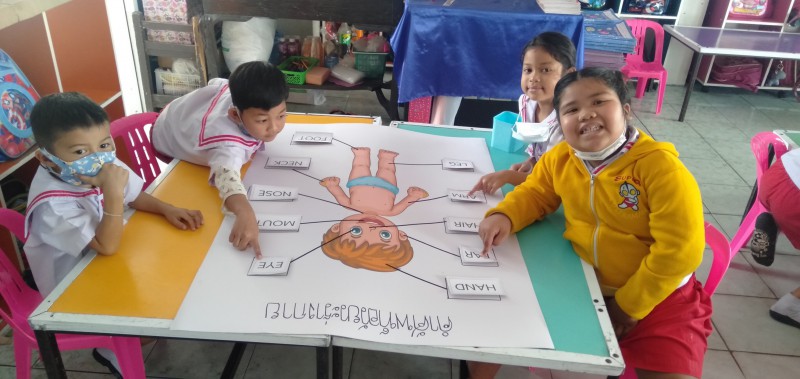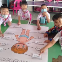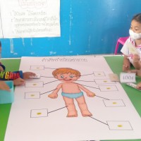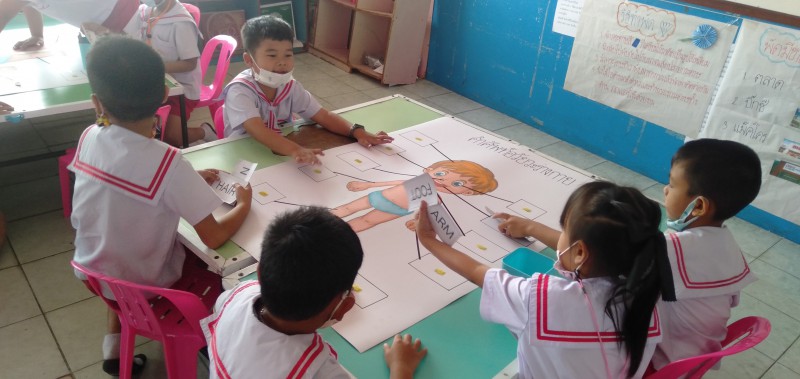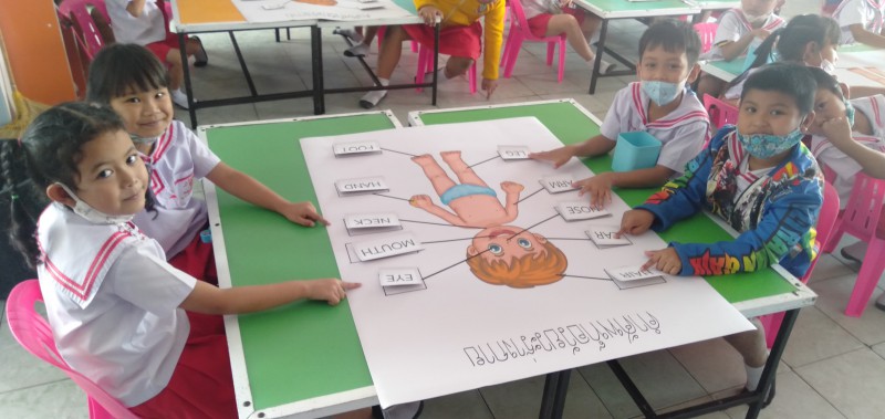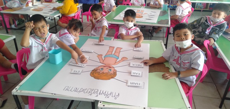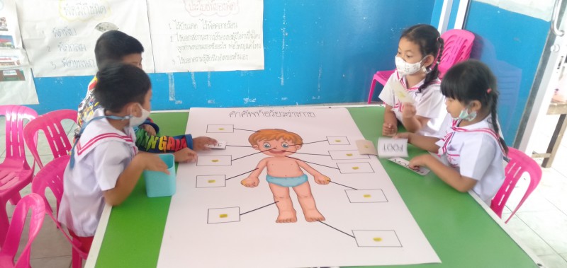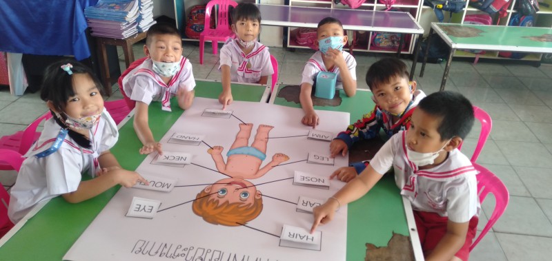 แนวทางการจัดกิจกรรม : ในกิจกรรมการเรียนรู้เรื่อง คำศัพท์อวัยวะร่างกาย นักเรียนได้เรียนรู้คำศัพท์ของร่างกายได้ลงมือปฏิบัติจริงผ่านการเล่นโดยนำคำศัพท์อวัยวะไปติดให้ตรงกับภาพ และอ่านออกเสียง