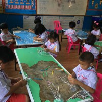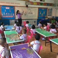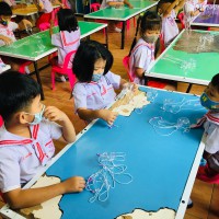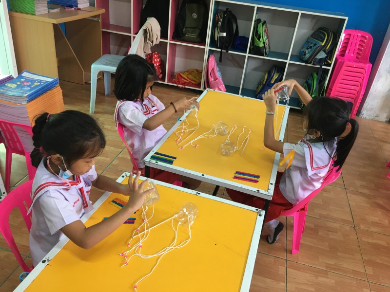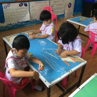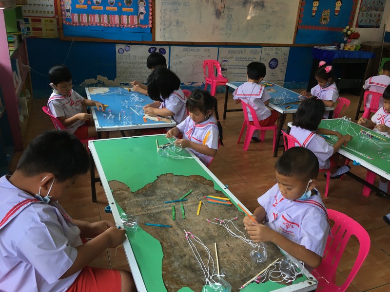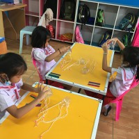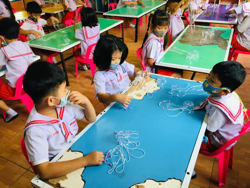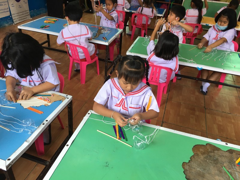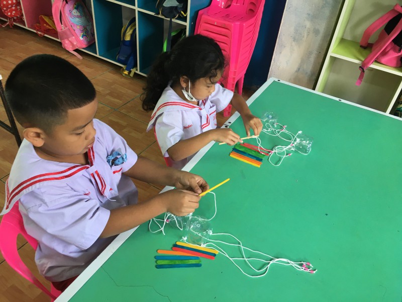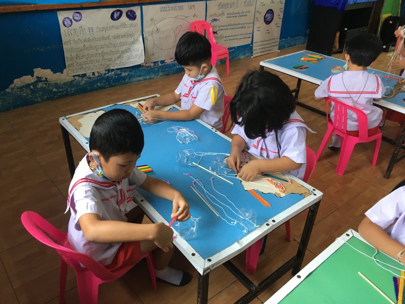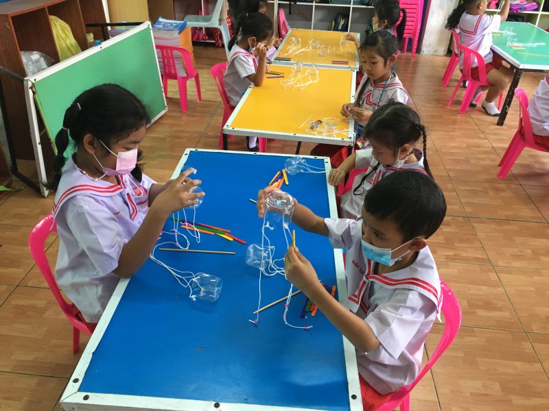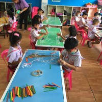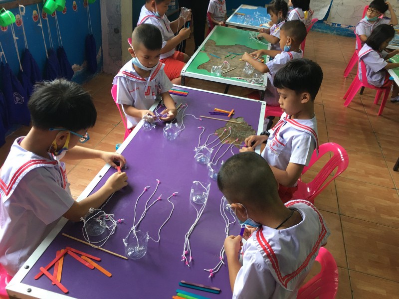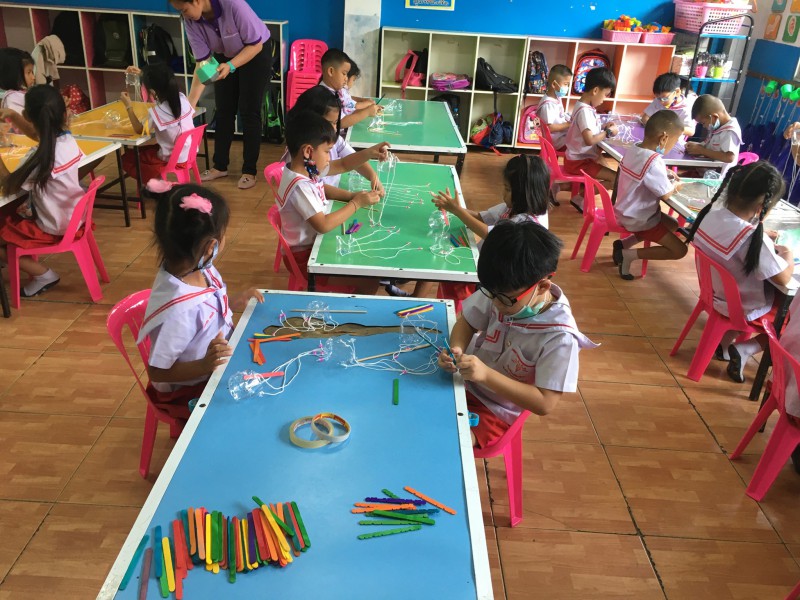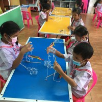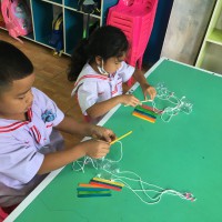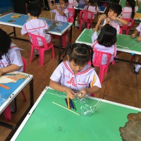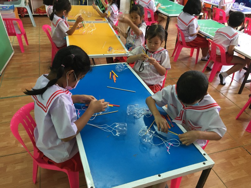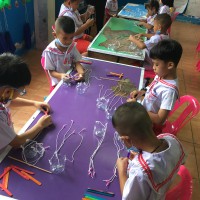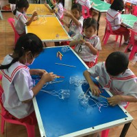 แนวทางการจัดกิจกรรม แบ่งกลุ่ม4-5 คน คุณครูแจกอุปกรณ์ ในการประดิษฐ์โมบาย คุณครูแนะนำอุปกรณ์ต่างๆ พร้อมสาธิตวิธีการทำ และลงมือปฎิบัติจริงทักษะที่นักเรียนได้รับ : นักเรียนได้ใช้กระบวนการคิดแบบกลุ่มโดยช่วยกันคิด และสร้างสรรค์ เชื่อมโยงการสร้างสิ่งประดิษฐ์และได้เรียนรู้วิธีการทำต่างๆ พร้อมฝึกสมาธิ