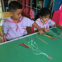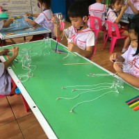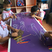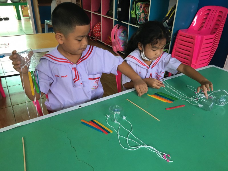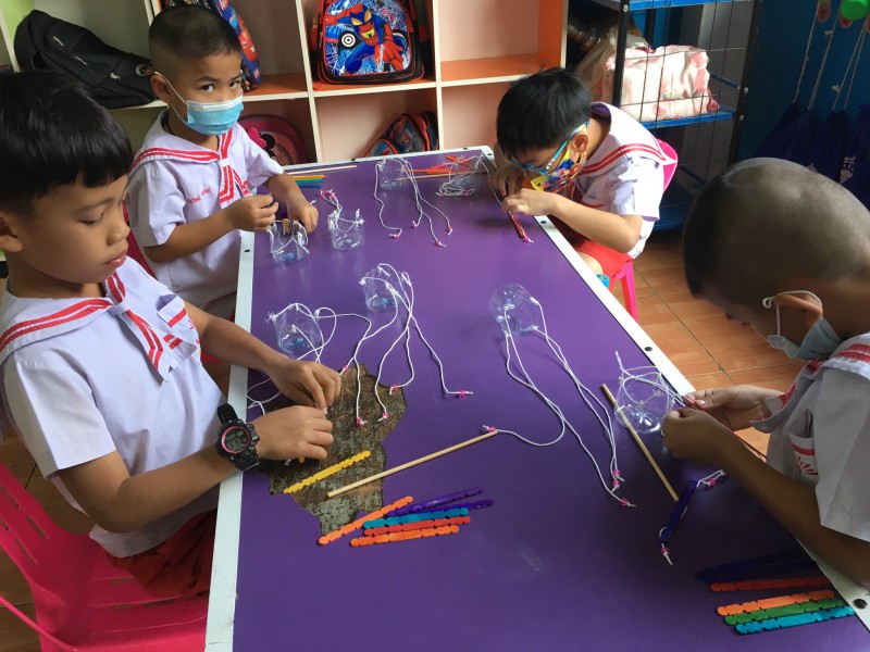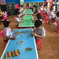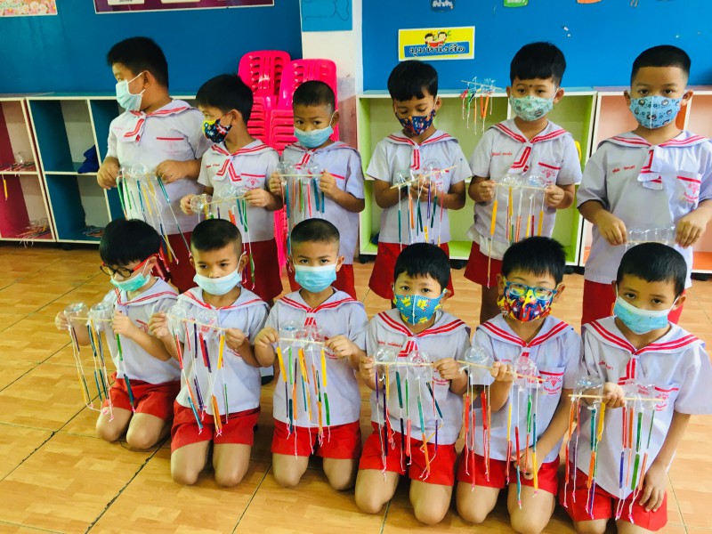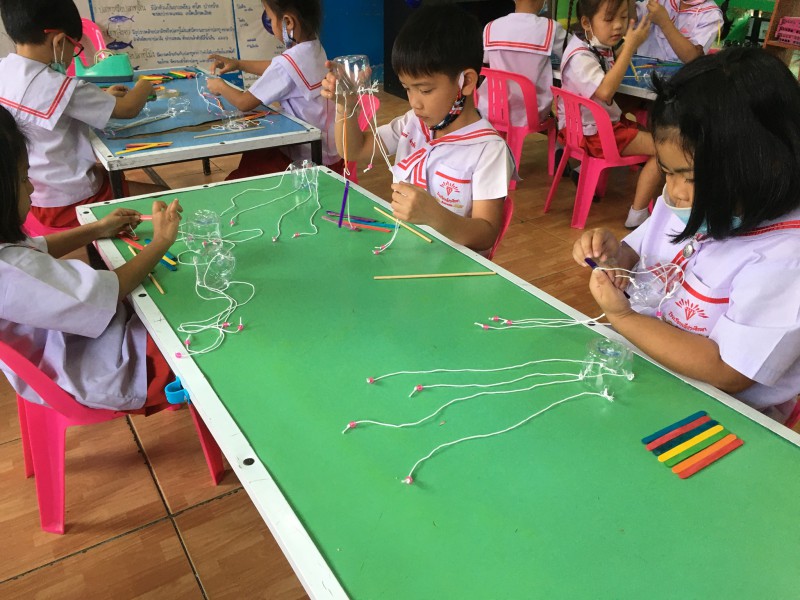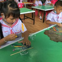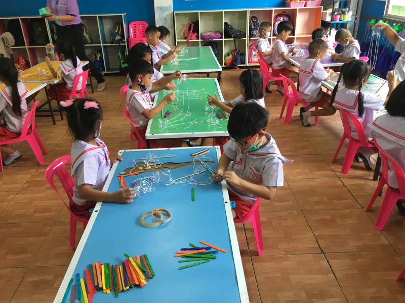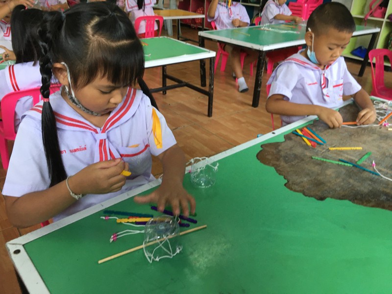 แนวทางการจัดกิจกรรม แบ่งกลุ่ม4-5 คน คุณครูแจกอุปกรณ์ ในการประดิษฐ์โมบาย คุณครูแนะนำอุปกรณ์ต่างๆ พร้อมสาธิตวิธีการทำ และลงมือปฎิบัติจริงทักษะที่นักเรียนได้รับ : นักเรียนได้ใช้กระบวนการคิดแบบกลุ่มโดยช่วยกันคิด และสร้างสรรค์ เชื่อมโยงการสร้างสิ่งประดิษฐ์และได้เรียนรู้วิธีการทำต่างๆ พร้อมฝึกสมาธิ